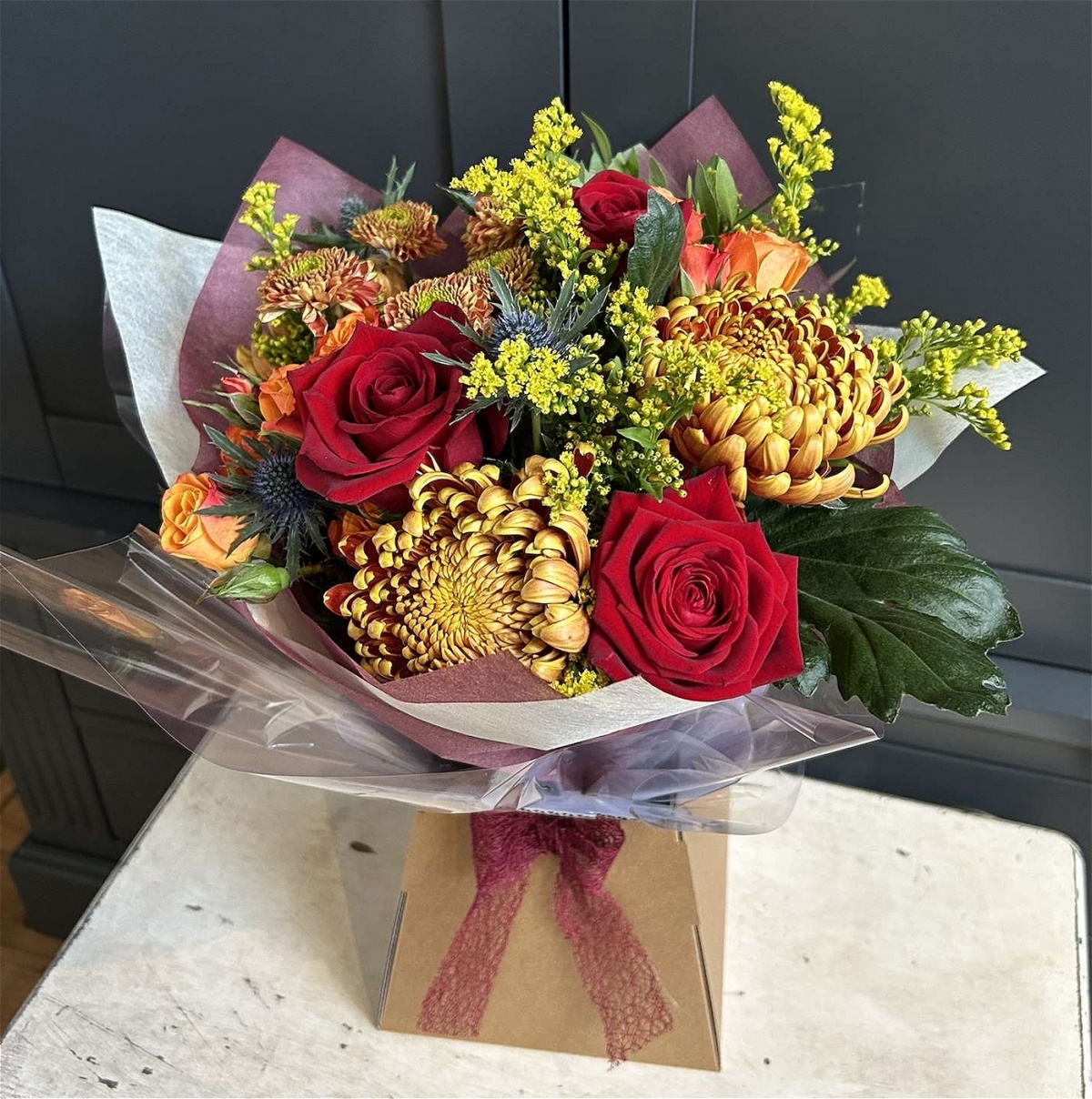 A touch of autumn with rustic red, orange and yellow flowers and complimentary foliage.