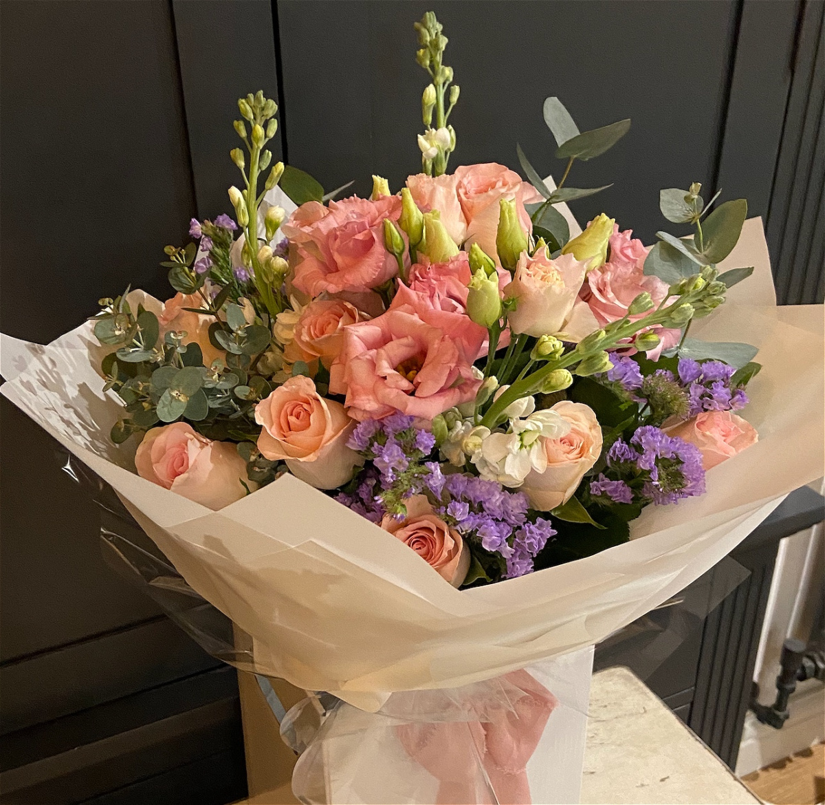 Our special collection is now available —gorgeous arrangements designed to make someone's day extra special. Hand tied, pink roses, lisianthus and stocks, with eucalypus foliage, wrapped and boxed finsished off with a bow.